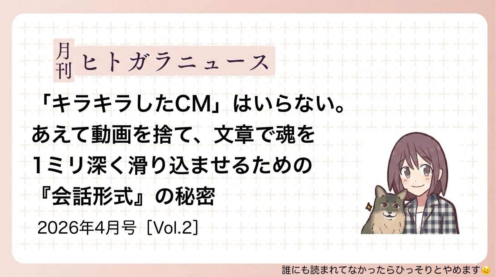 「キラキラしたCM」はいらない。あえて動画を捨て、文章で魂を1ミリ深く滑り込ませるための『会話形式』の秘密【月刊ヒトガラニュース vol.2 2026年4月号】